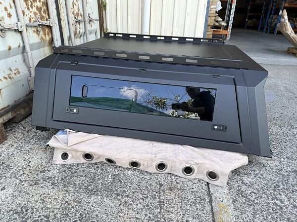 Introducing the TRADECAP GEN 2 Heavy Duty Steel Canopy with Pre-fitted Pet Sliding Window Side Doors, specially designed to fit Ford Ranger PX123 2012-2021 Dual Cab Ute Tubs. This canopy comes in a sleek Matte Black Powder Coated finish. If you prefer a different color, you can easily have it spray-painted to match your vehicle's color.