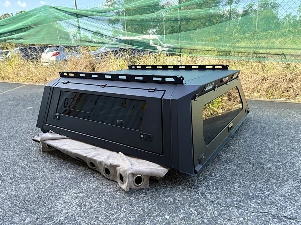 Introducing the TRADECAP GEN 2 Heavy Duty Steel Canopy with Pre-fitted Pet Sliding Window Side Doors, specially designed to fit Nissan Navara NP300 D23 2015-On Dual Cab Ute Tubs. This canopy comes in a sleek Matte Black Powder Coated finish. If you prefer a different color, you can easily have it spray-painted to match your vehicle's color.
